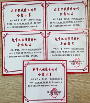 公司員工獲得《起重機(jī)維保培訓(xùn)合格證書》